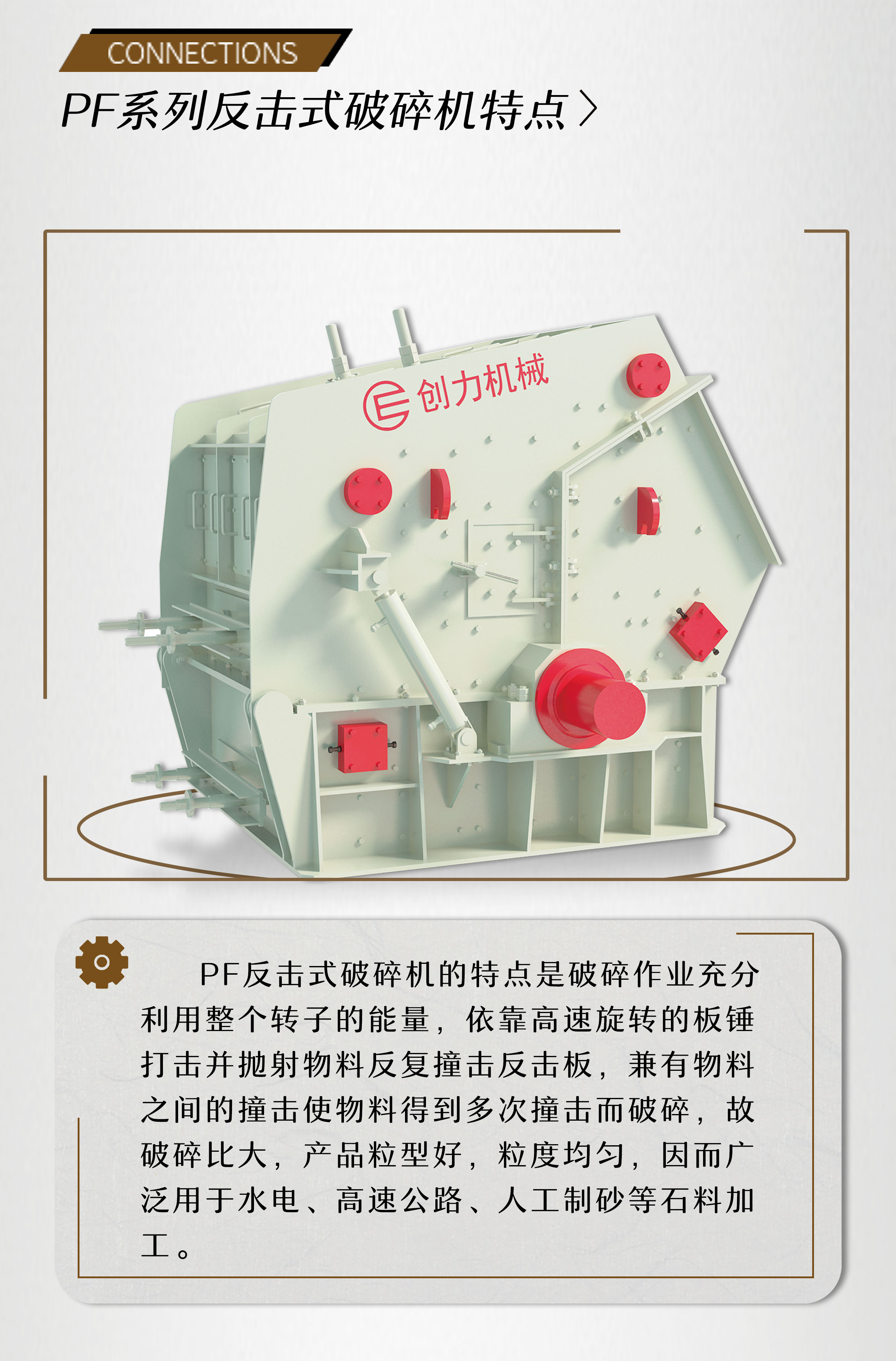 PF反擊式破碎機(jī)的特點(diǎn)是破碎作業(yè)充分利用整個(gè)轉(zhuǎn)子的能量,依靠高速旋轉(zhuǎn)的板錘打擊并拋射物料反復(fù)撞擊反擊板,兼有物料之間的撞擊使物料得到多次撞擊而破碎,故破碎比大,產(chǎn)品粒型好,粒度均勻,用于水電,高速公路,人工制砂等石料加工。